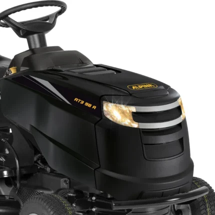 The tractor features a 95 cm steel cutting deck, which allows large areas to be mowed quickly and efficiently. The deck is equipped with dual blades for superior cutting performance, and the mowing height can be adjusted from 25 mm to 100 mm, offering maximum flexibility for achieving a perfectly manicured lawn or maintaining a more natural, longer turf. The deck is also designed with anti-scalp wheels, which prevent damage when operating on uneven terrain or near obstacles.