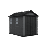 With its generous 7.5ft x 9ft footprint, the Newton Plus shed offers ample interior space for storing garden tools, lawn equipment, bicycles, outdoor furniture, and seasonal items. The front-entry design provides easy access for larger items, while the dark grey finish adds a sleek, contemporary appearance that blends seamlessly into modern outdoor spaces.