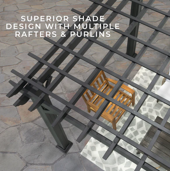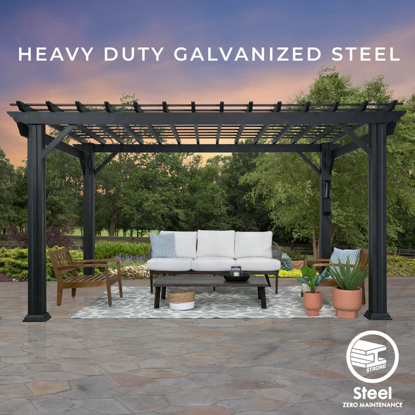 The Stratford 16′ × 12′ Black Steel Pergola is a durable and stylish outdoor structure designed to provide shade and elegance to any backyard, patio, or garden. Constructed from high-quality steel with a powder-coated finish, this pergola ensures long-lasting performance while resisting rust and weather damage. Its included sail shade soft canopy adds protection from the sun while enhancing comfort and usability.