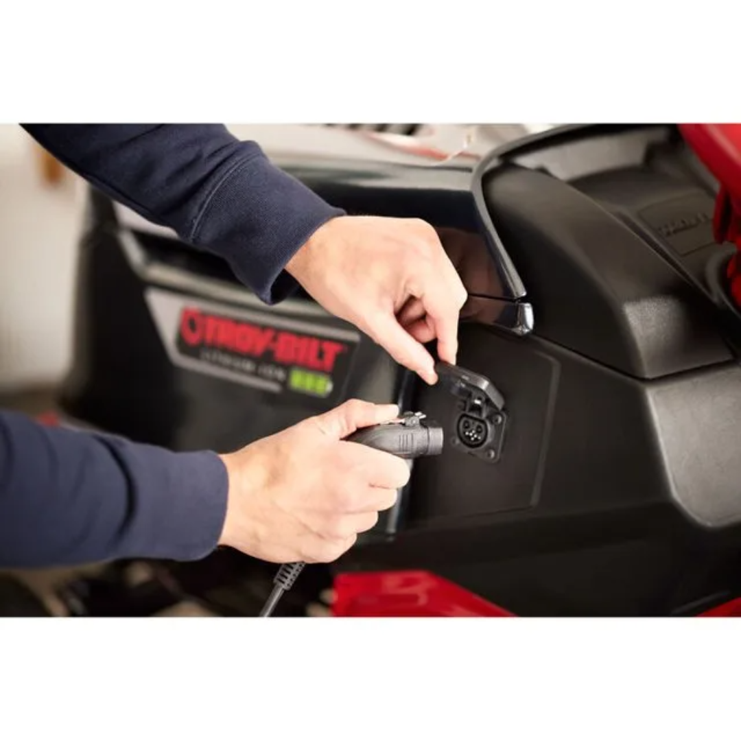 Skip the gas cans and oil changes with the battery-powered Troy-Bilt Super Bronco 46E XP riding mower. The electric brushless motor provides the power to mow up to 2 acres of grass with up to 1.5-hours of runtime per charge. A large Step-Thru frame is designed for easy on-and-off access and an adjustable high-back seat provides comfort. The rear hitch allows for quick attachment of tow-behind accessories, like dump carts, spreaders or aerators (attachments sold separately). Regardless of what time of day you need to mow, the battery power provides a noise reduction of up to 65% quieter than gas.