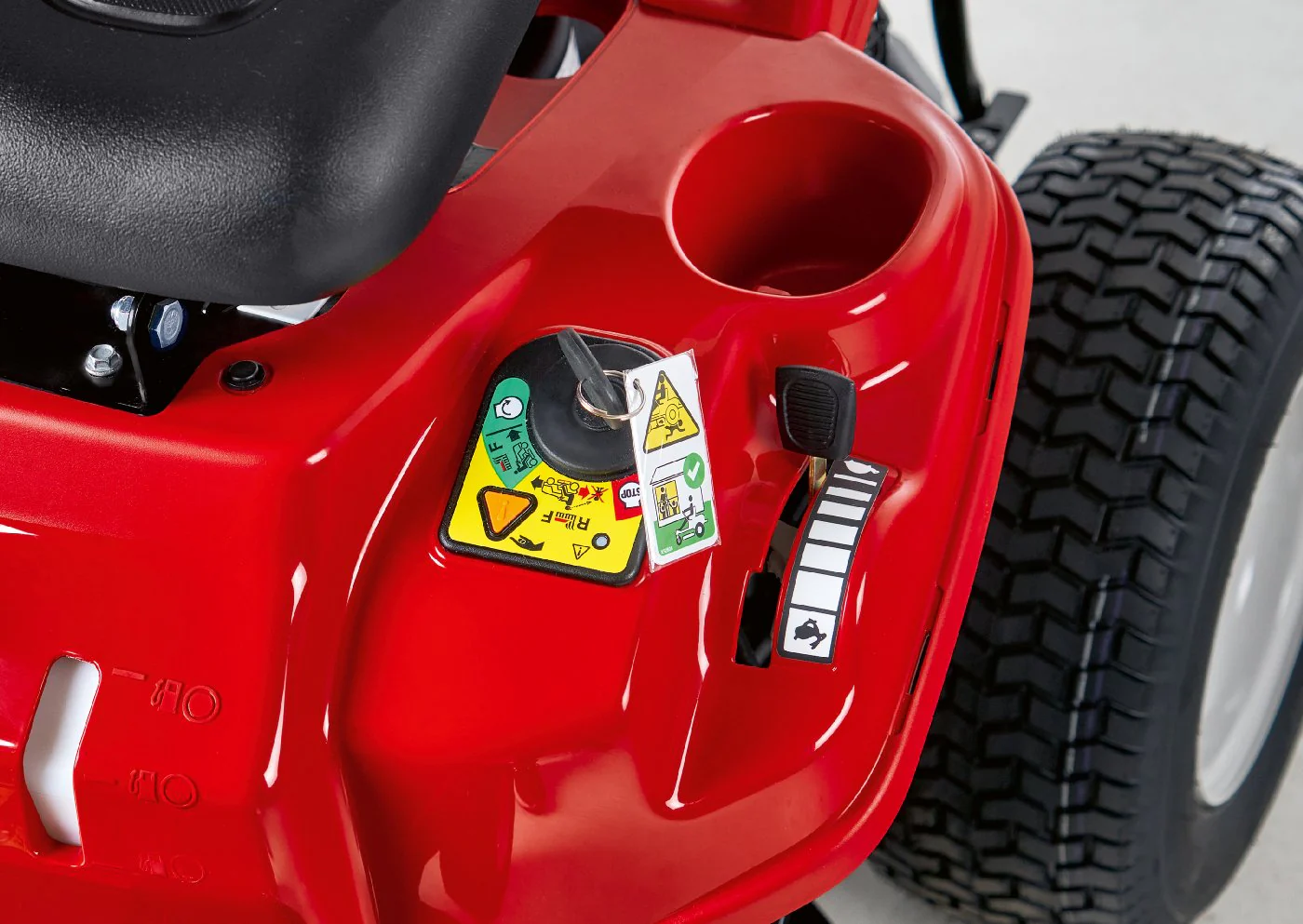 Comfort and convenience are integrated: an electric key start system, step‑through frame for easier mounting, comfort seat, and a large fuel tank help improve user experience. The side‑discharge format means there is no bag to empty, simplifying use in situations where collecting clippings isn’t practical or needed. For those who prefer mulching, a mulching kit is offered as an optional accessory, allowing the machine to adapt to different mowing preferences or lawn conditions.