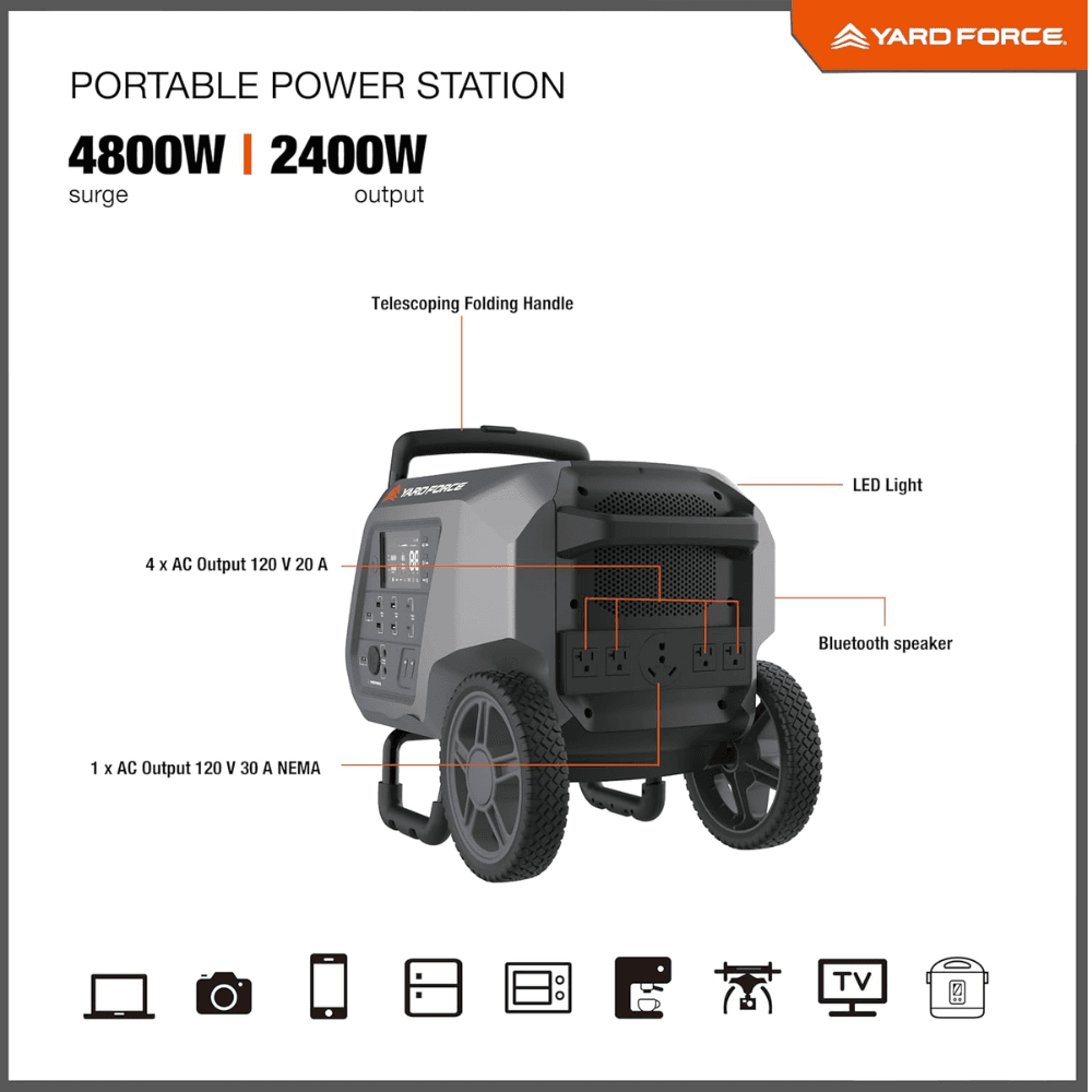 Home Generators Yard Force Portable Power Station 2400-Watt Continuous 4800-Watt Peak, Bluetooth speaker